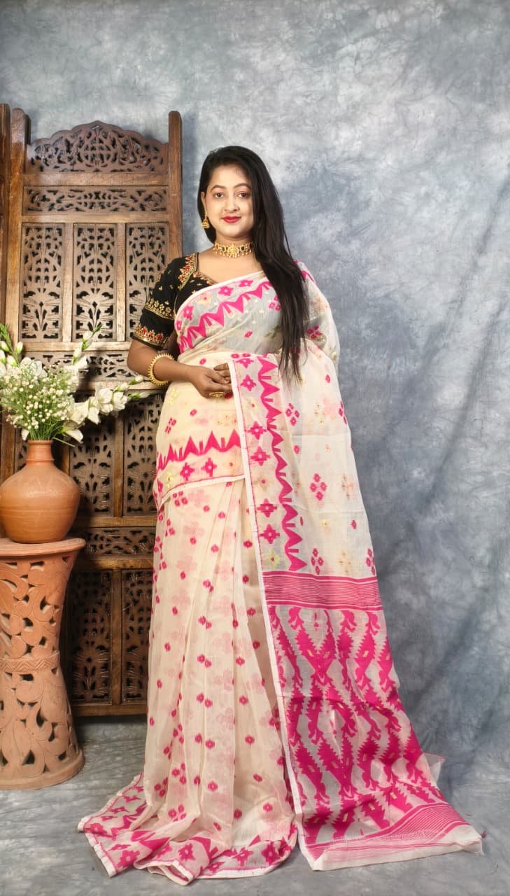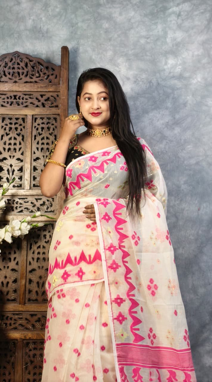 White Soft Buti Jamdani Sari With Blouse Piece