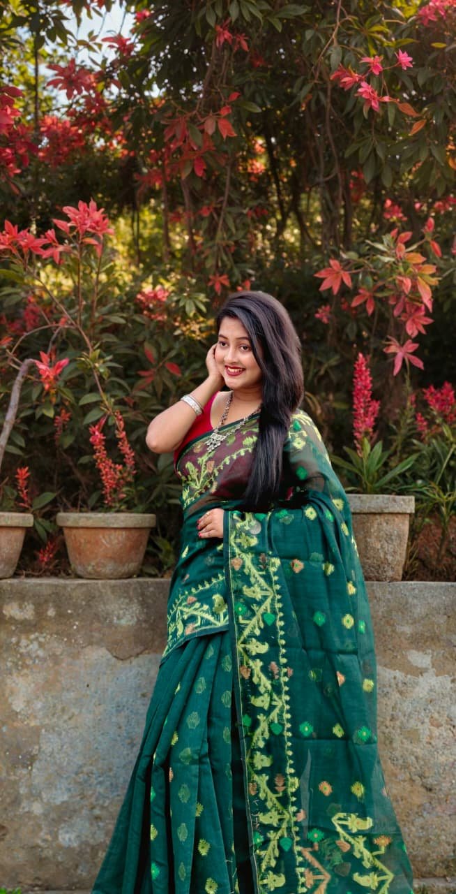 Dark Teal Soft Buti Korat Jamdani Sari With Blouse Piece