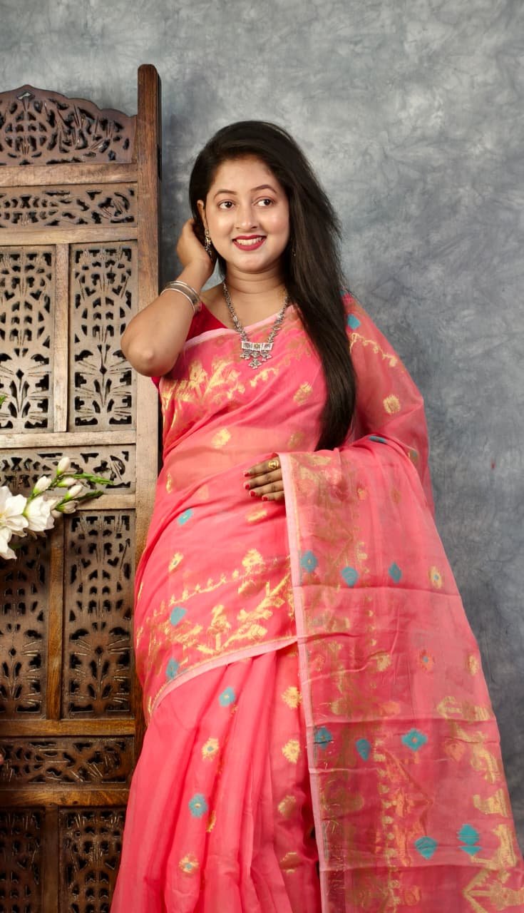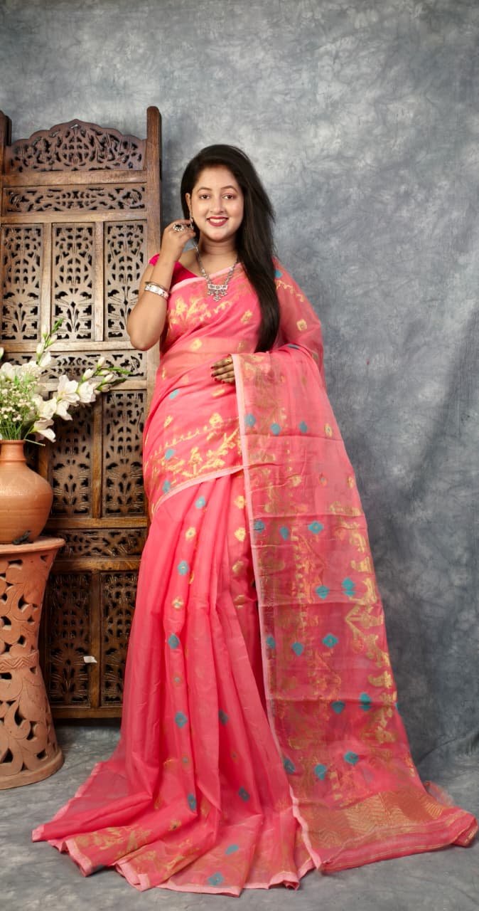 Be the first to review “Faded Red Soft Buti Korat Jamdani Sari With Blouse Piece” Cancel reply
