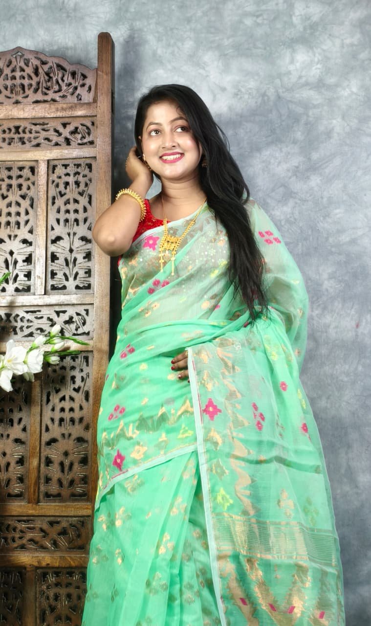 Green Teal Soft Jori Buti Dhakai Jamdani Sari