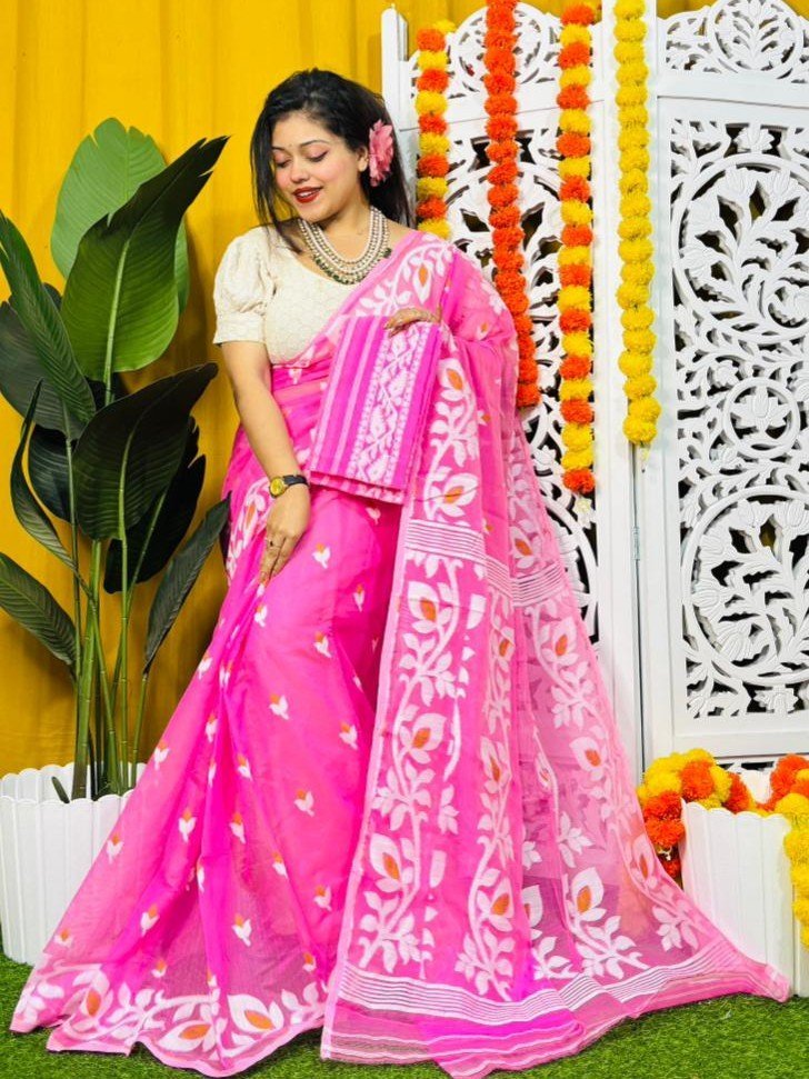 Pink Rose Korat Buti Soft Jamdani Sari With Blouse Piece