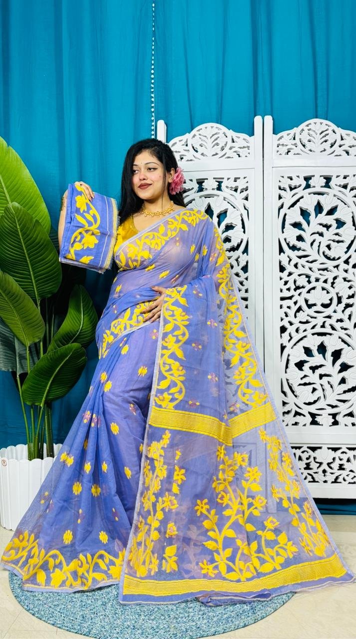 Moody Blue Soft Lota Jamdani Sari With Blouse Piece
