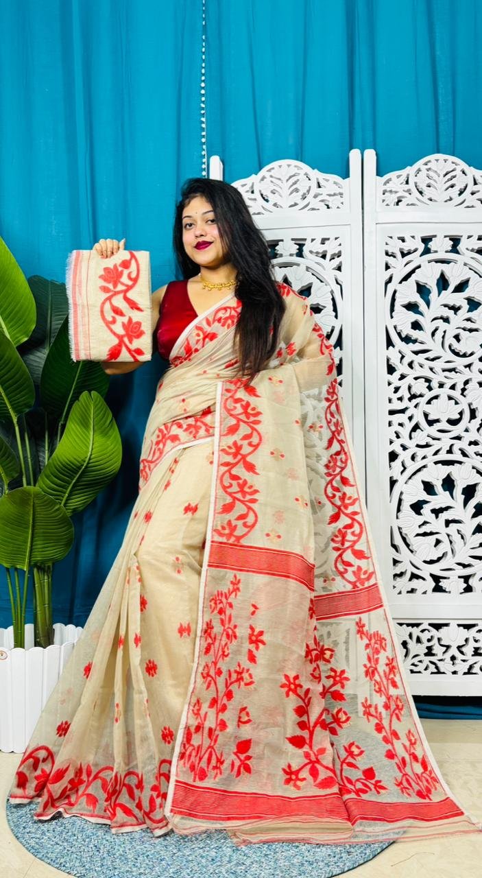 Loto Pata Soft Red Jamdani Sari