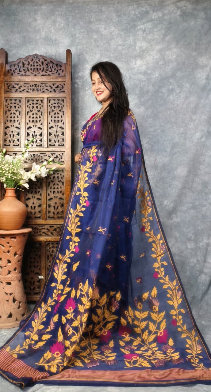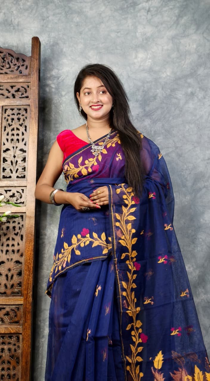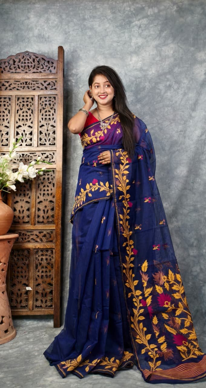 Navy Blue Soft Bonolota Jamdani Sari
