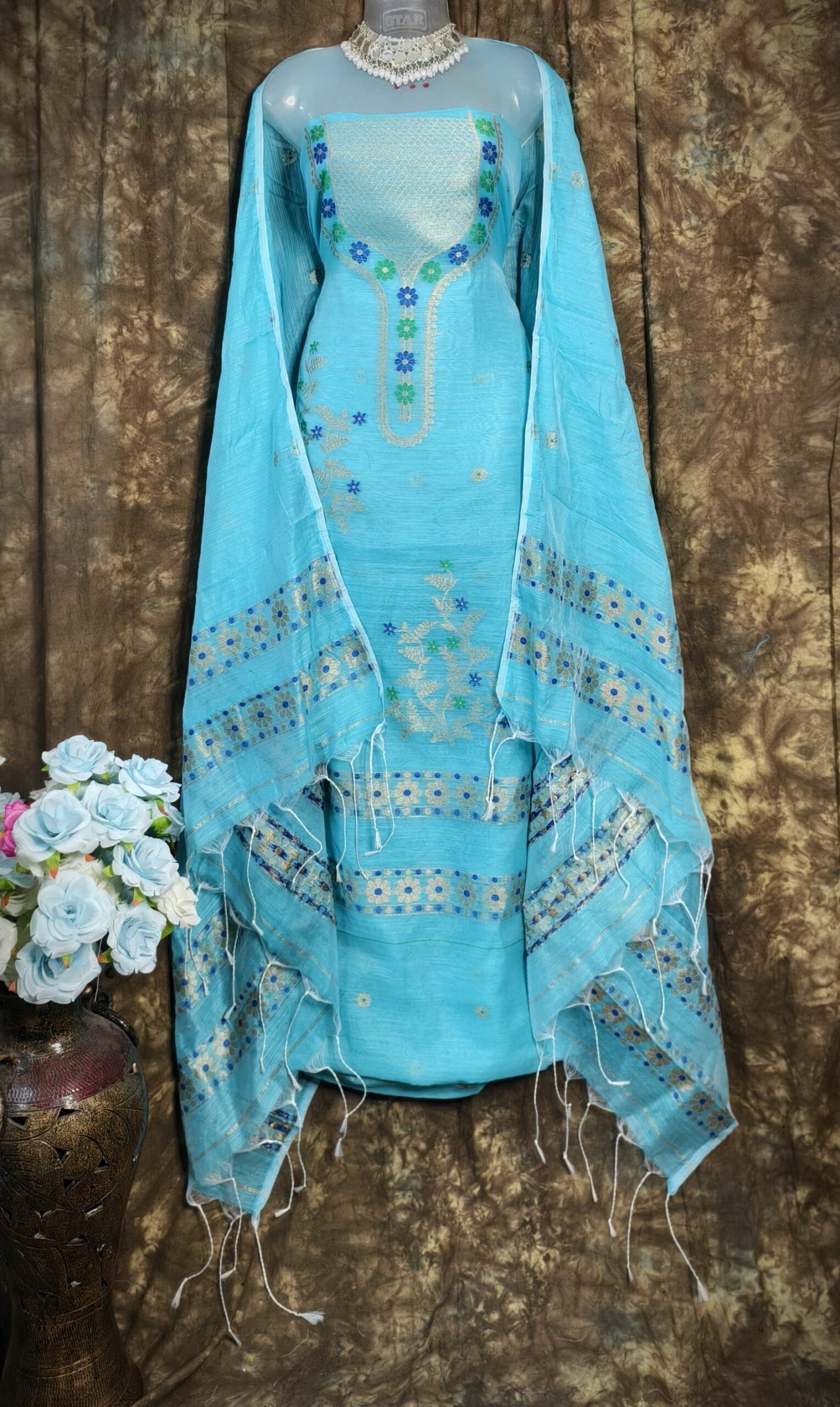 Nayan Tara Blue Ice Muga Cotton Unstitched Jamdani Suit Set