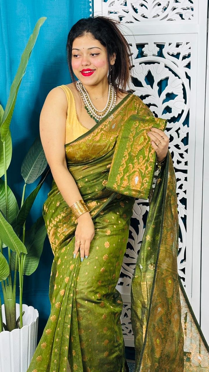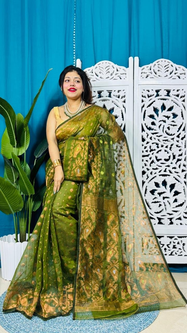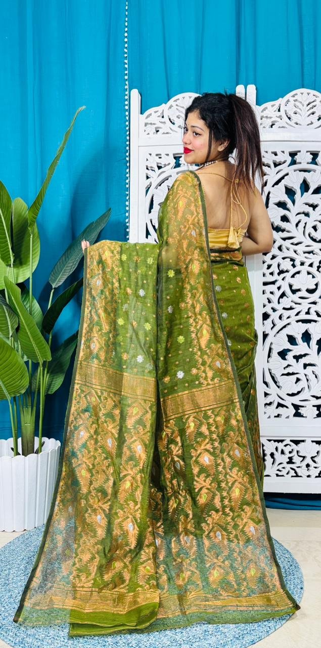 Olive Soft Golden Buti Jamdani Sari With Blouse Piece