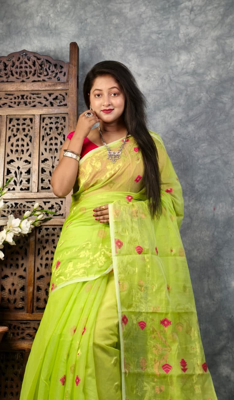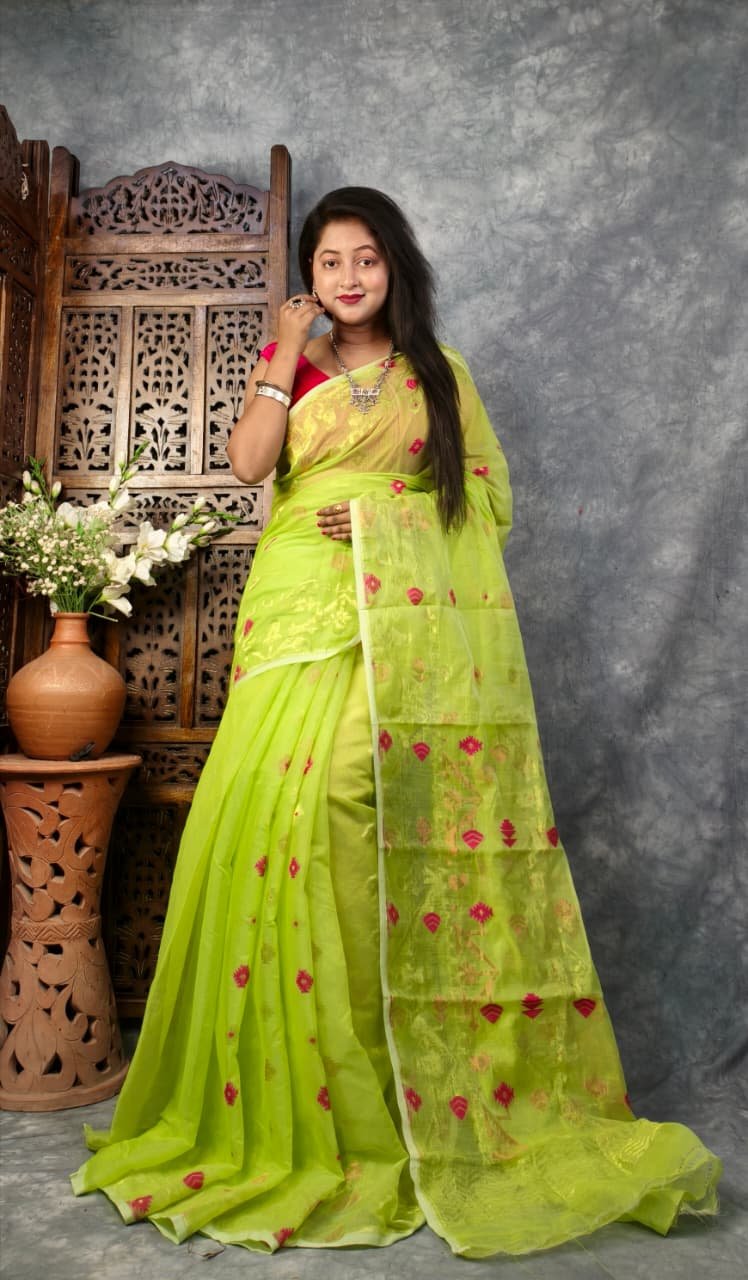 Pea Green Soft Buti Korat Jamdani Sari With Blouse Piece