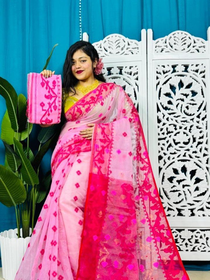 Persian Pink Korat Buti Soft Jamdani Sari With Blouse Piece