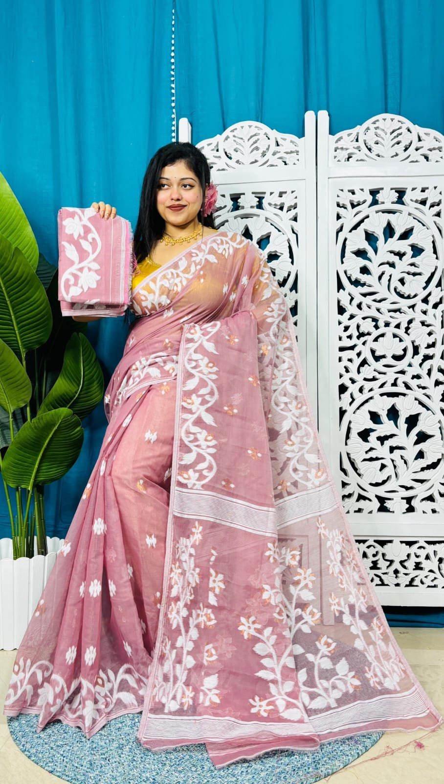 Pink Daisy Soft Lota Jamdani Sari With Blouse Piece