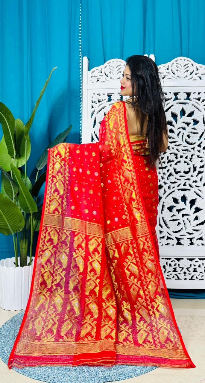 Loto Pata Soft Tomato Red Jamdani Sari