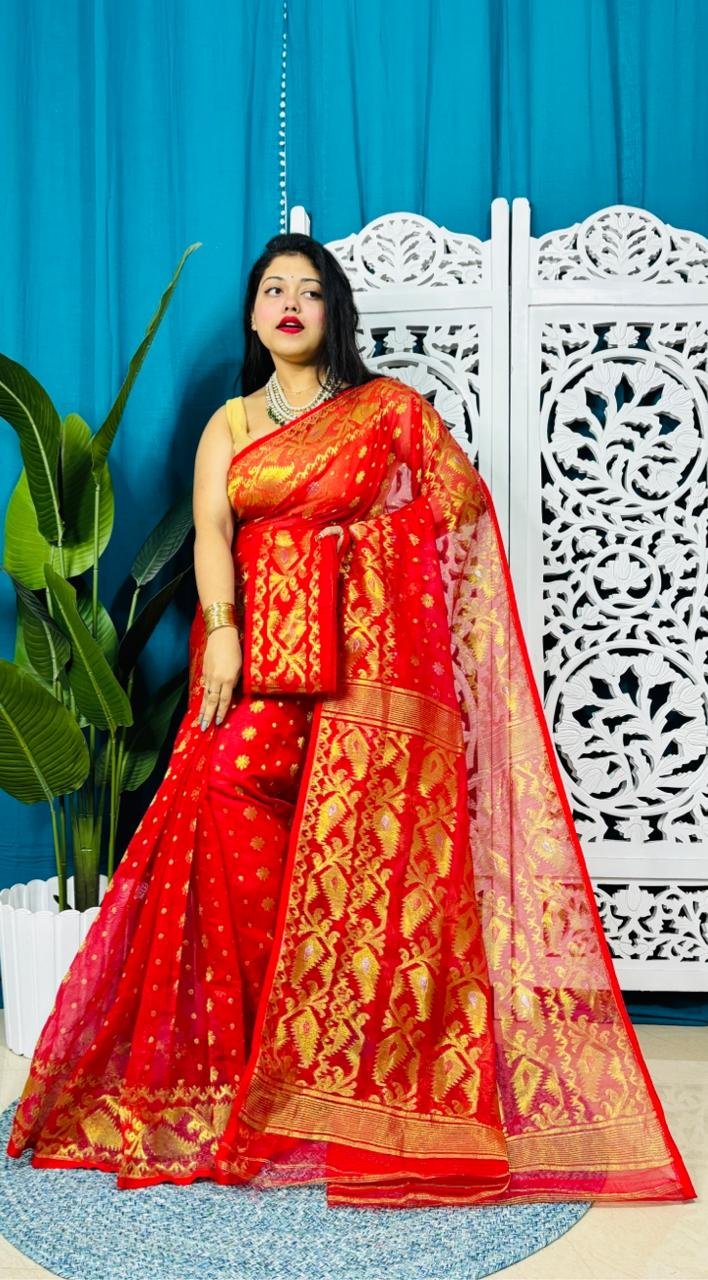Red Soft Golden Buti Jamdani Sari With Blouse Piece