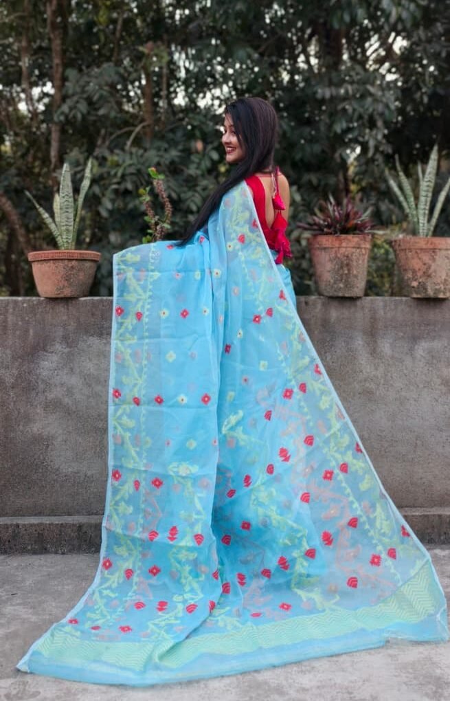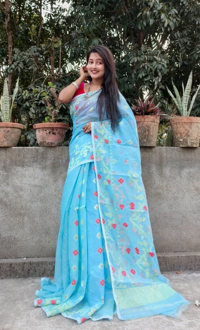 Be the first to review “Sky Blue Soft Buti Korat Jamdani Sari With Blouse Piece” Cancel reply