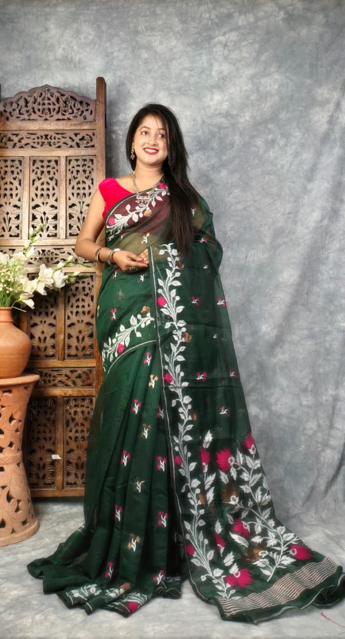 Timber Green Soft Bonolota Jamdani Sari