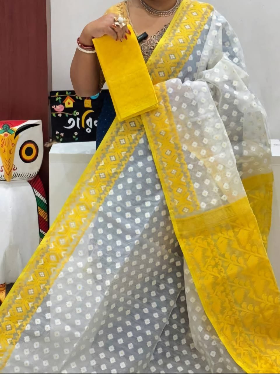 Ikkat Soft Off White Yellow Dhakai Jamdani Saree